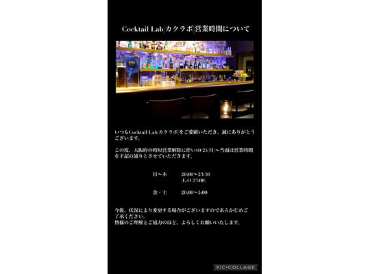 2020/05/25Cảm ơn bạn đã tiếp tục ủng hộ Cocktail Lab, một quán bar ở Shinsaibashi, Minami. Chúng tôi sẽ thông báo cho bạn về việc thay đổi giờ làm việc của c... -